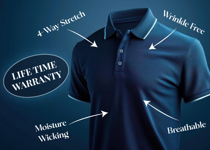A golf shirt is special and different from a normal shirt. It has a double-stitched collar with points designed to lay flat and sometimes a pocket on the left breast. The material used for making them is either a blend of 50/50 cotton/polyester or completely polyester providing maximum moisture wicking, and keeping you sweat-free.